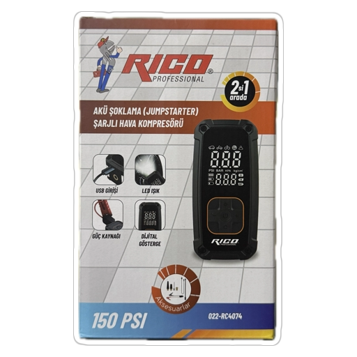 Rico RC4074, dijital akü takviye cihazı, lastik şişirme kompresörü, taşınabilir kompresör, araç acil durum kiti, akü takviye, lastik şişirme, araba aksesuarları.